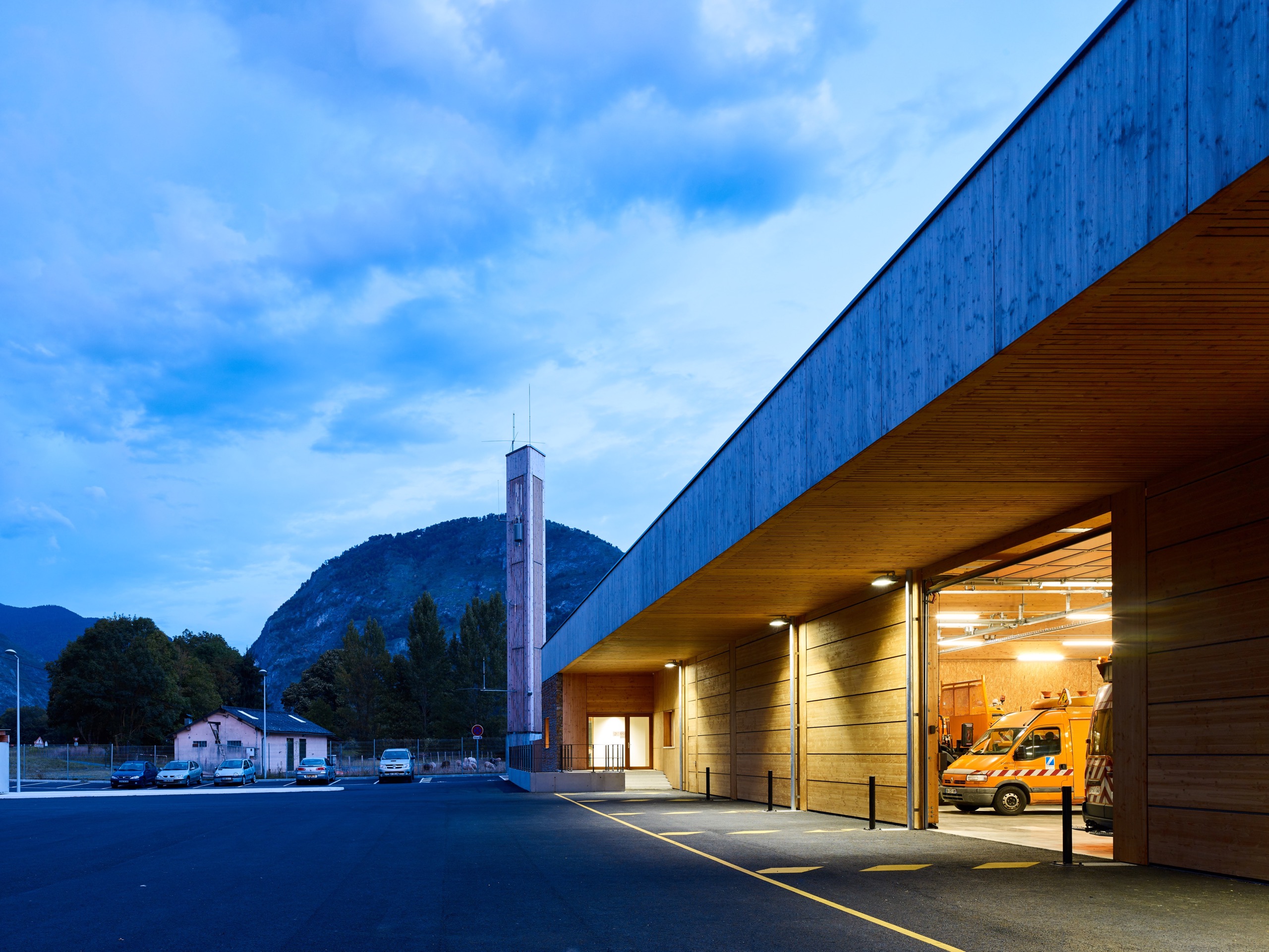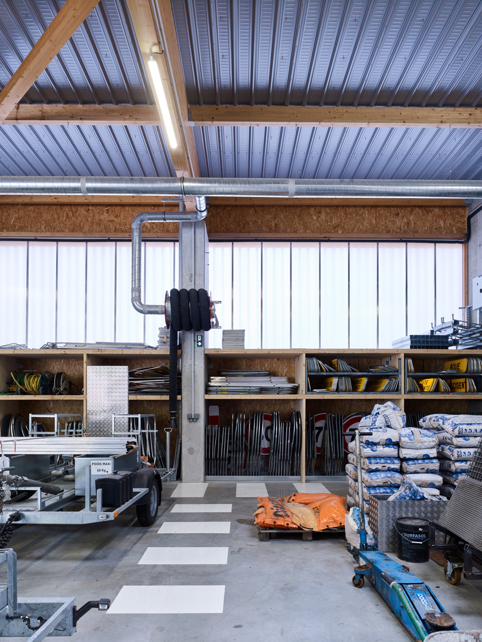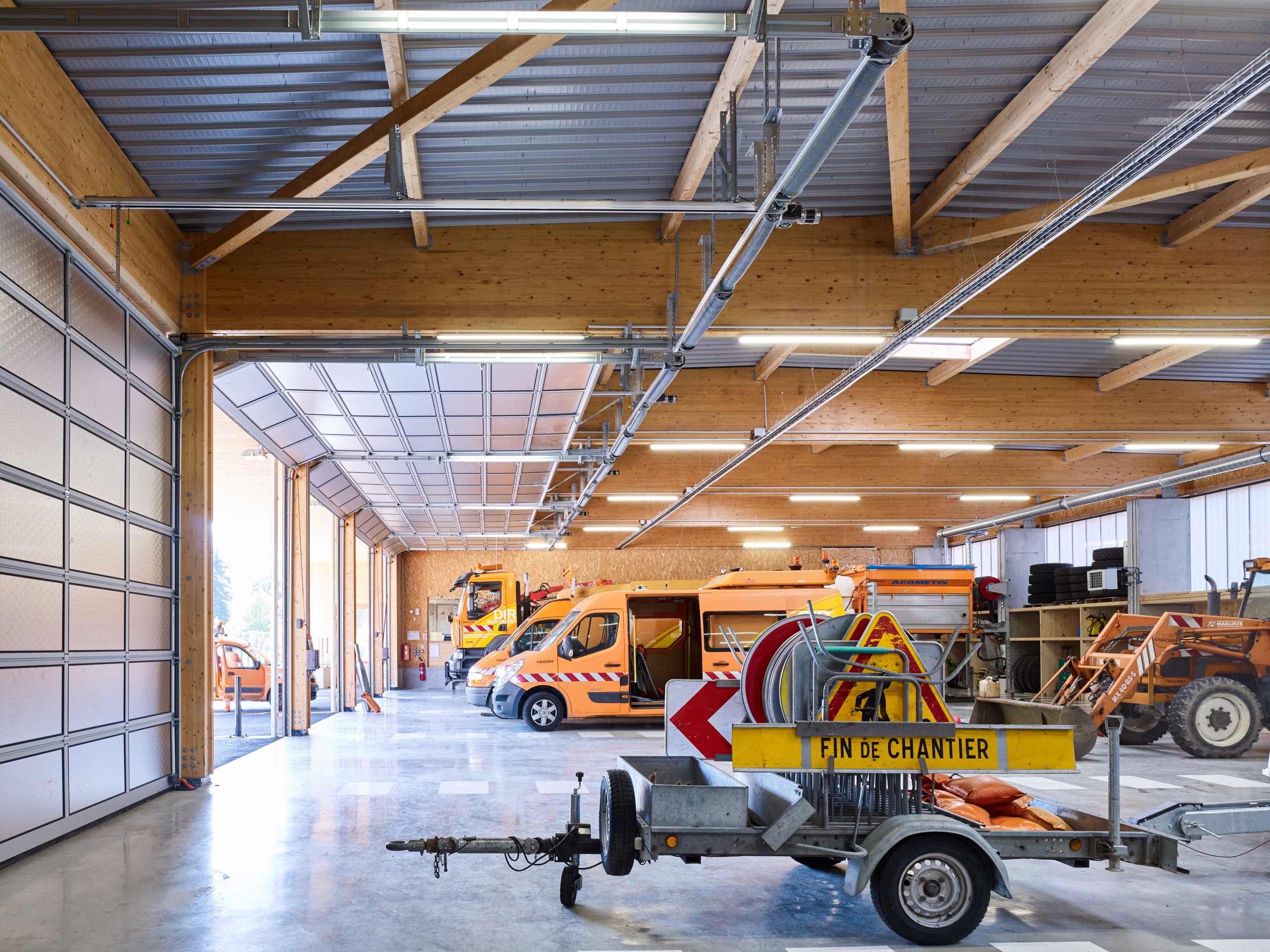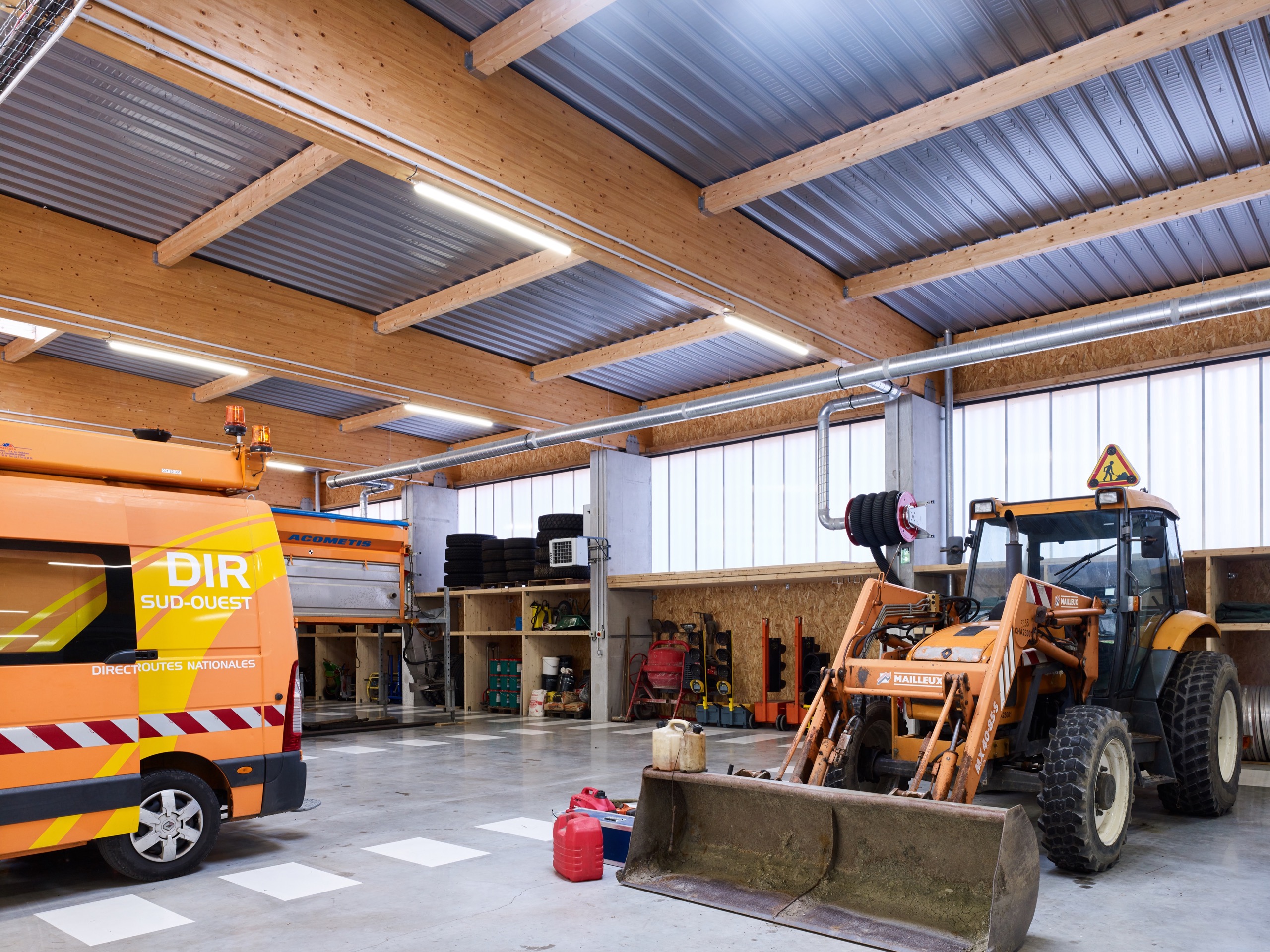– une grande halle abritant les véhicules et leurs équipements (lames de déneigement, remorques de signalisation, panneaux…)