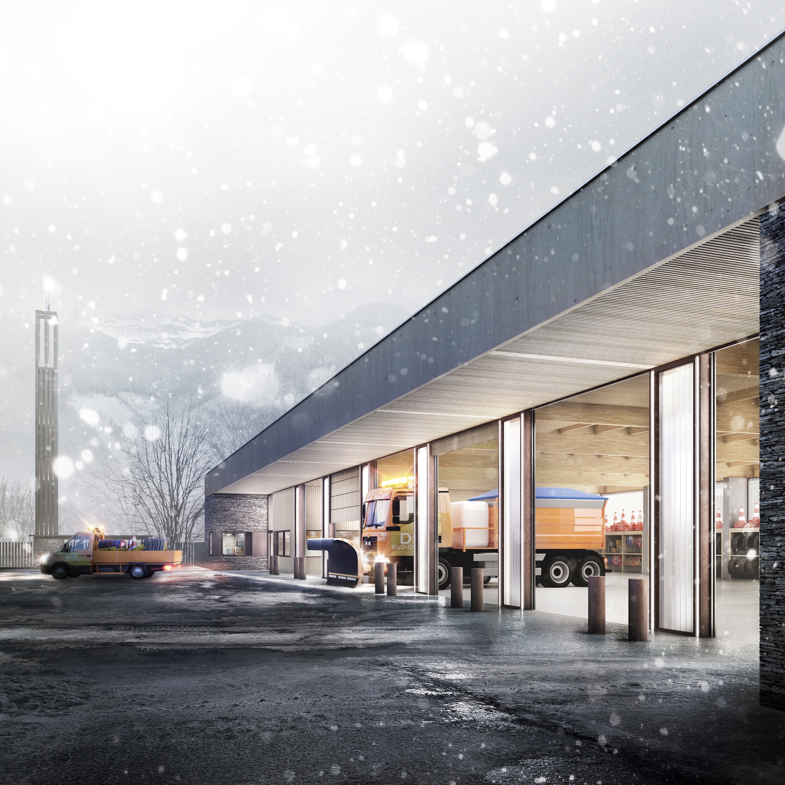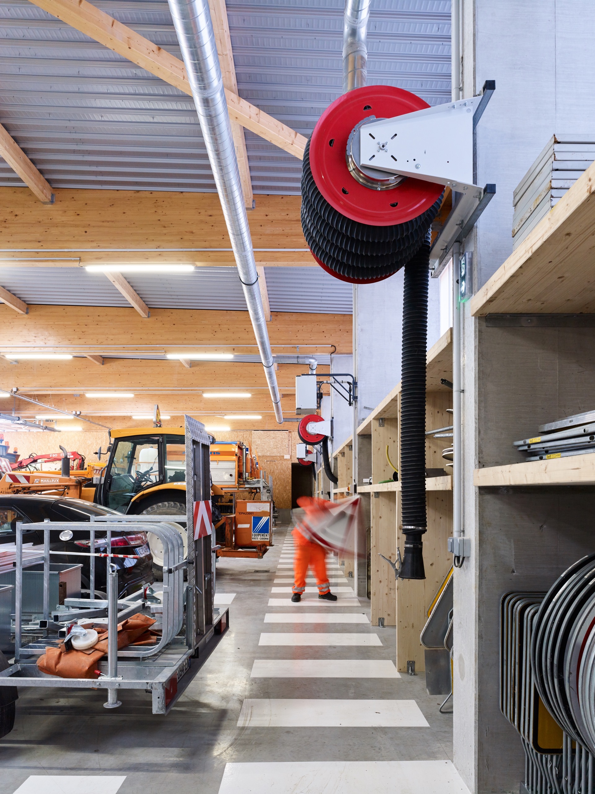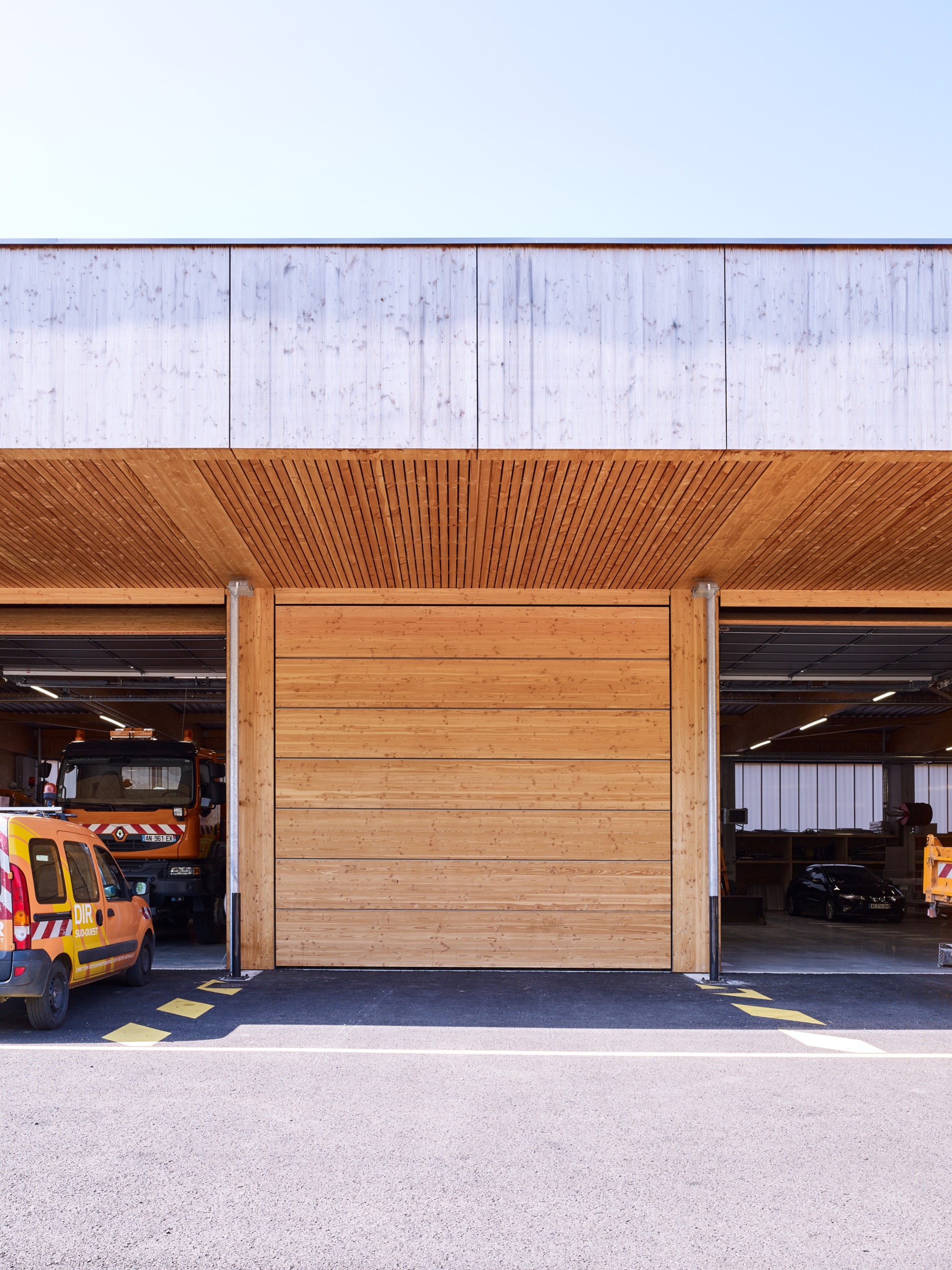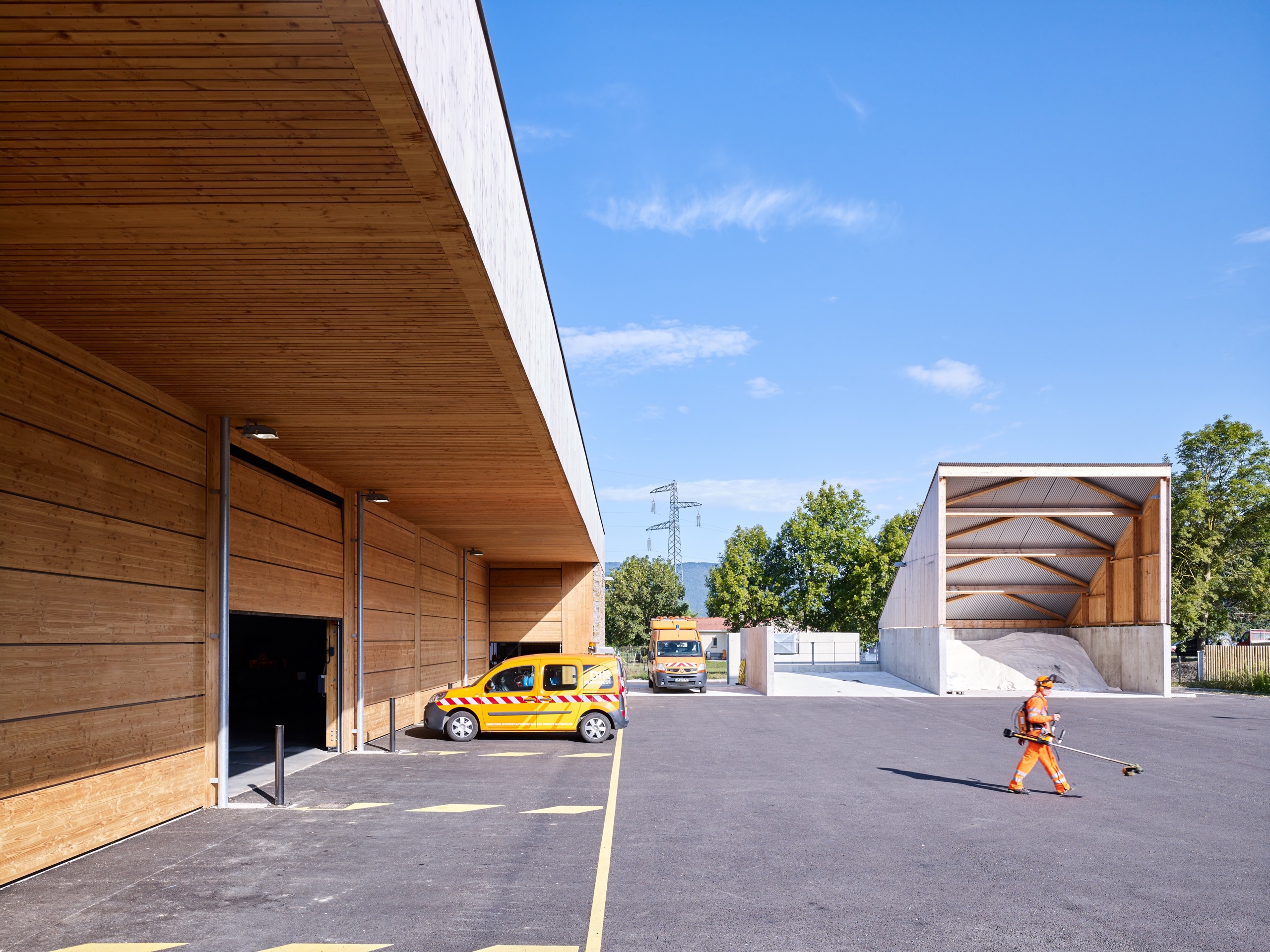 Cet équipement est pensé comme une extension du domaine de la route pour donner l’idée qu’il est à son service et pour permettre aux passants de voir le centre en action : les hommes s’affairer autour des véhicules, charger le sel, laver les camions après intervention…