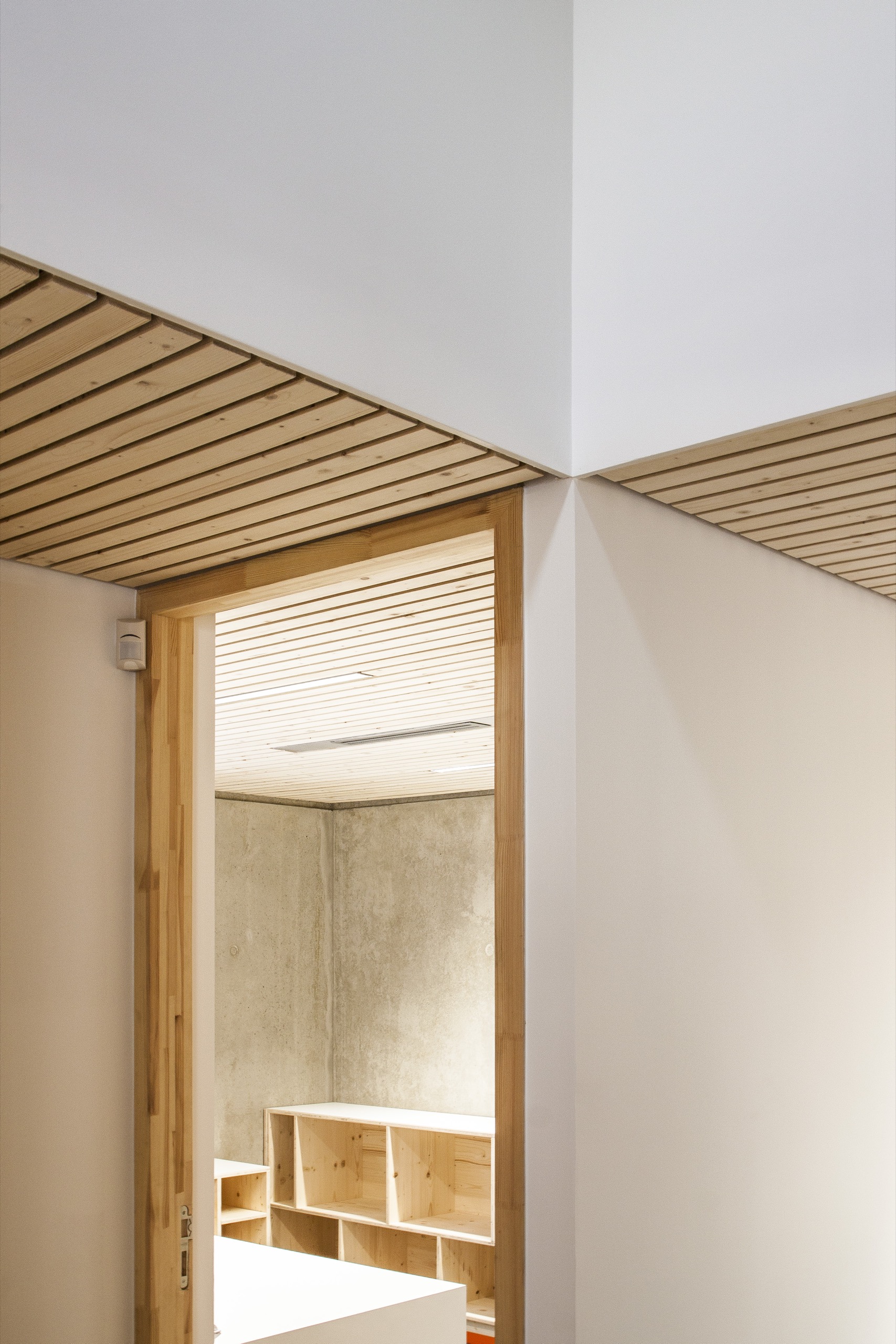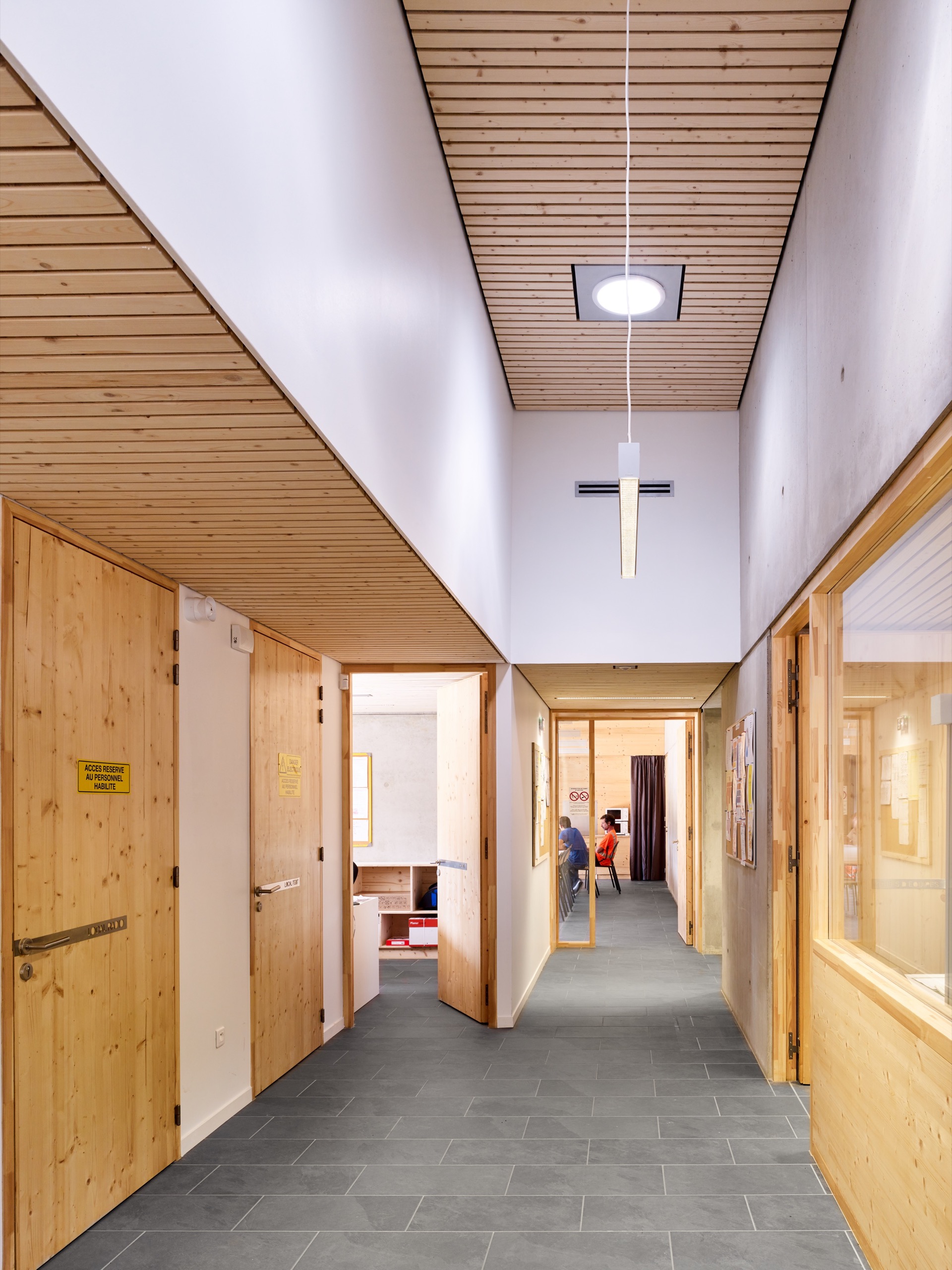 Nous avons limité au strict minimum les finitions « cosmétiques » (placo + peinture) pour laisser place aux matériaux bruts : le béton pour sa robustesse et pour répondre à la contrainte sismique, le bois pour les parois, les menuiseries, et les plafonds dans lesquels s’intègrent les éléments techniques (luminaires, ventilation, sécurité…).