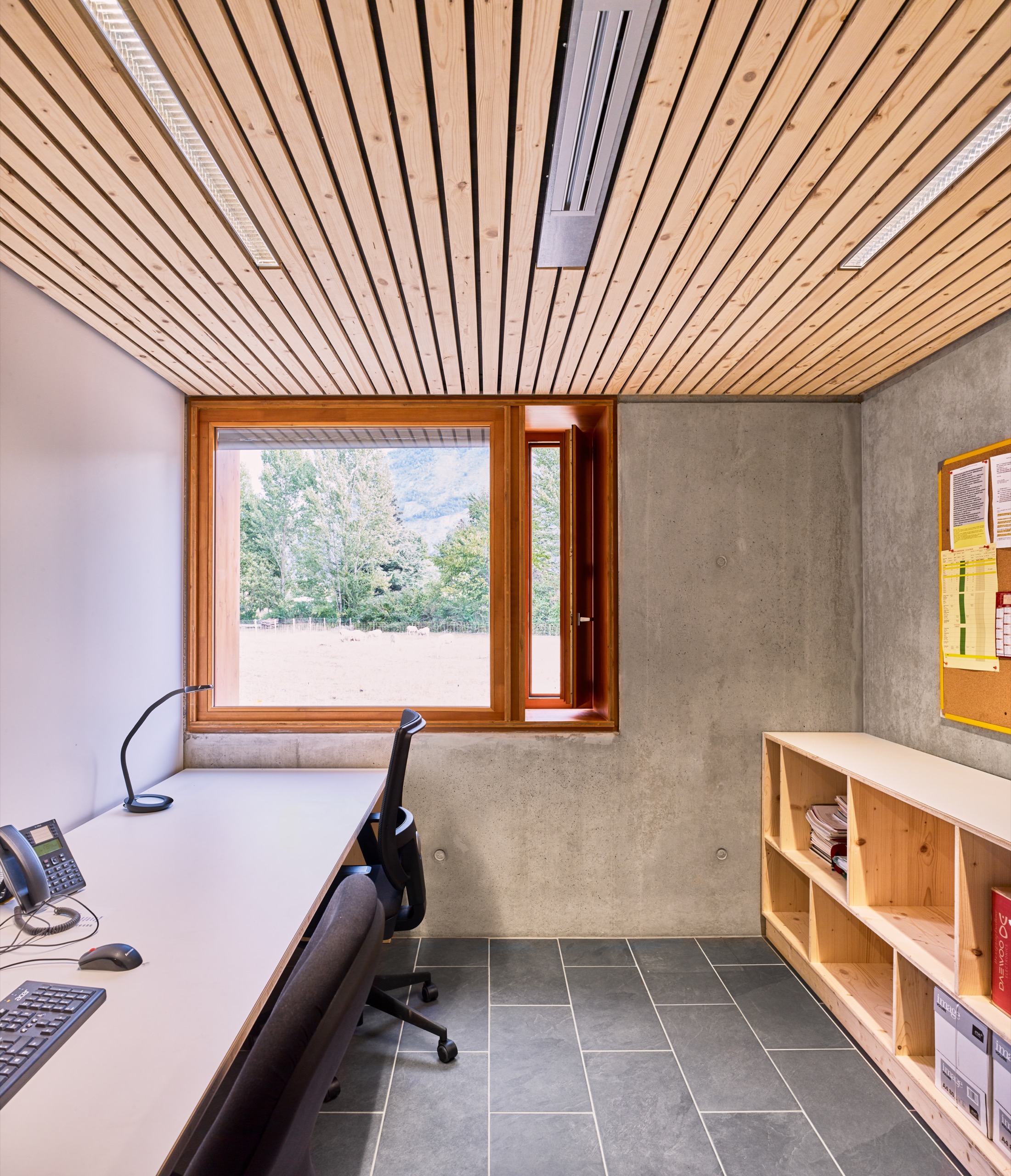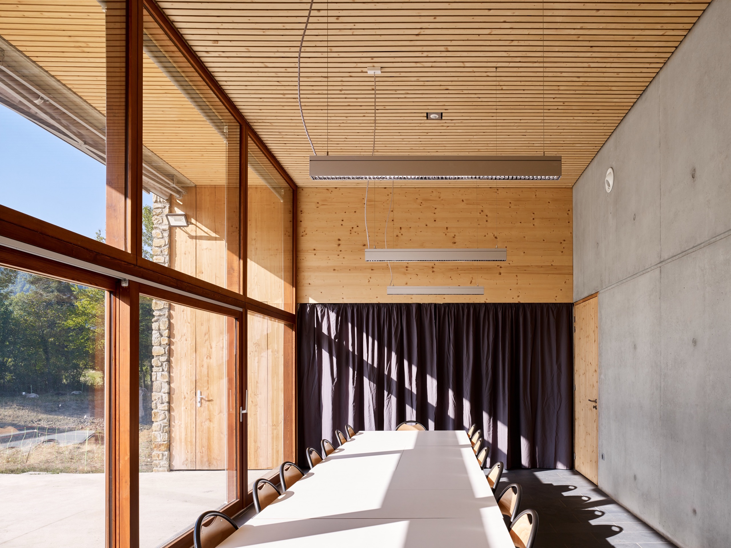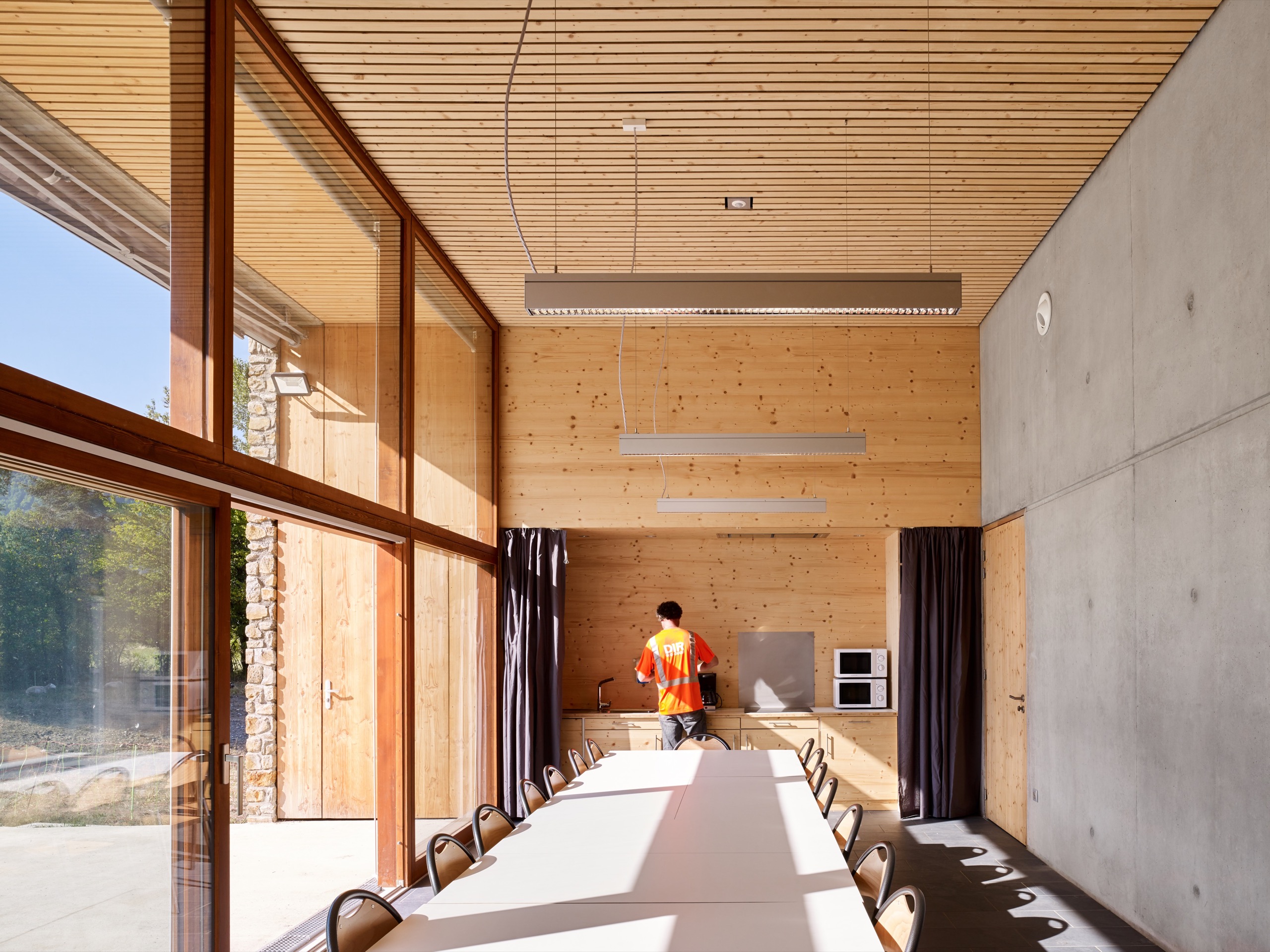 – des bureaux et salle de réunion/réfectoire où le travail (tâches administratives, préparation d’intervention et contrôle des différentes parties du site) se fait en profitant du paysage du massif du Burat.