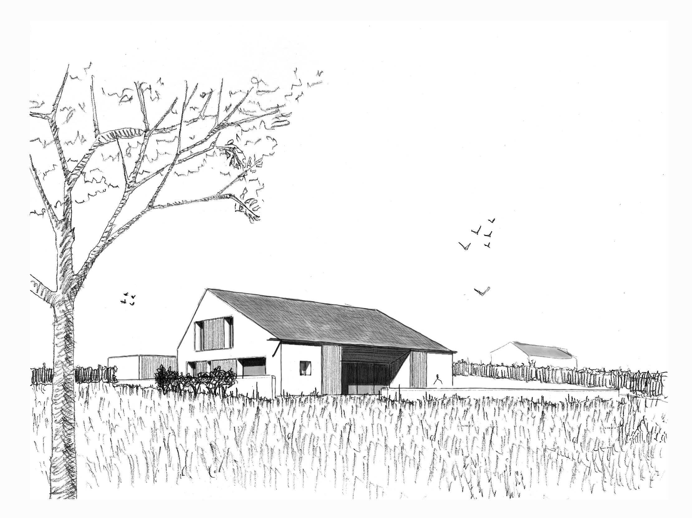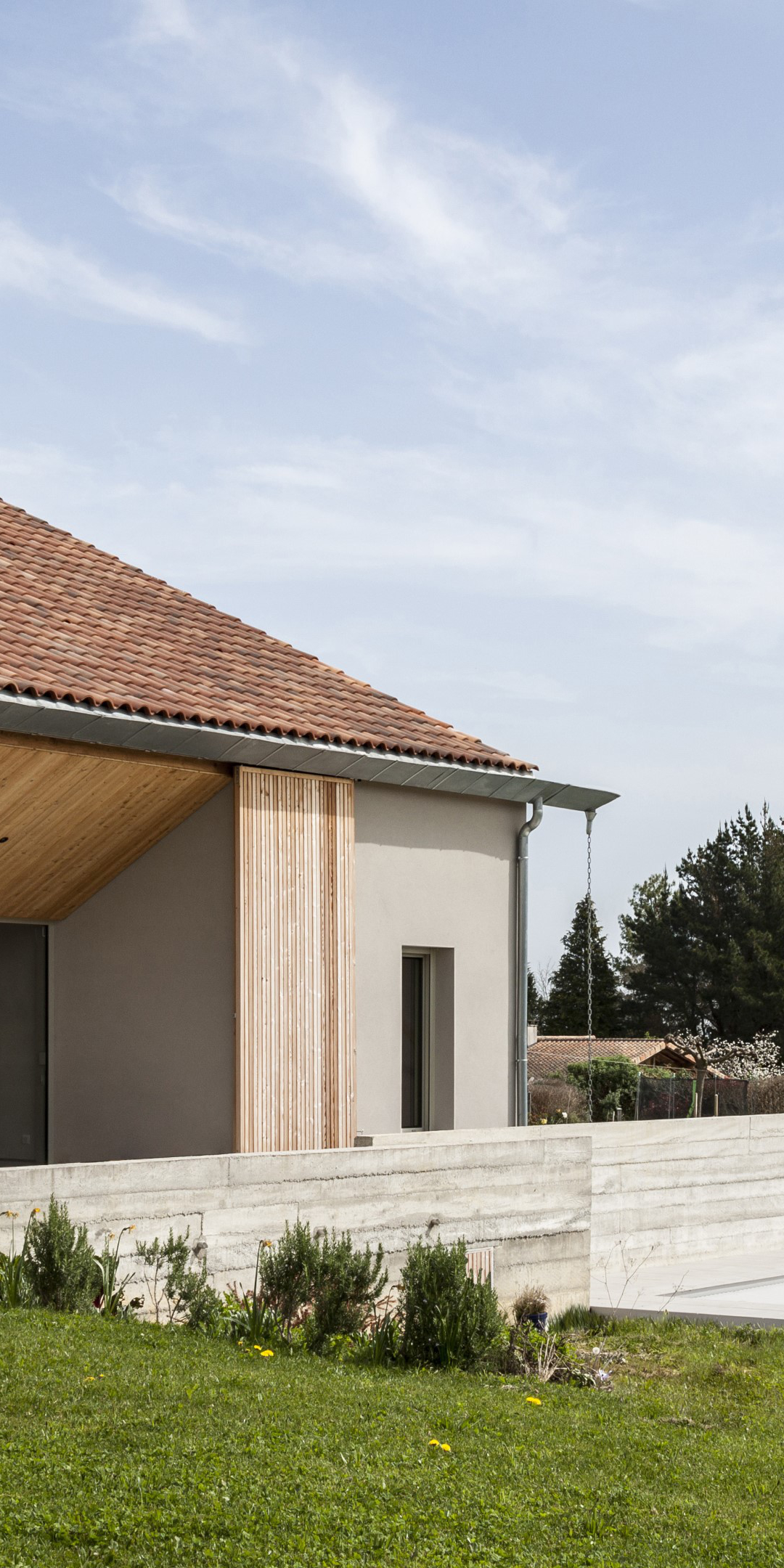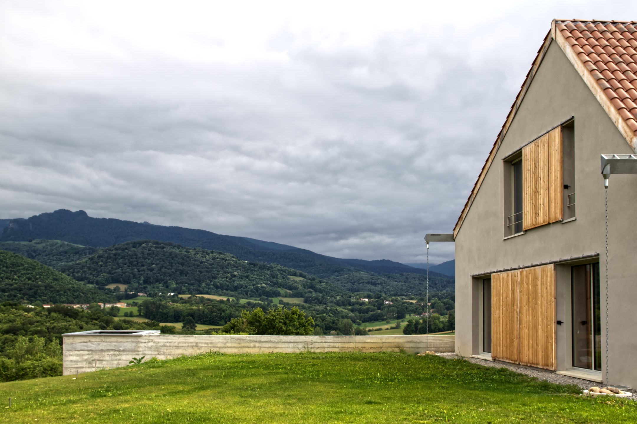 Construction d’une maison individuelle, dans un contexte agricole en limite de village, avec vue sur les Pyrénées.