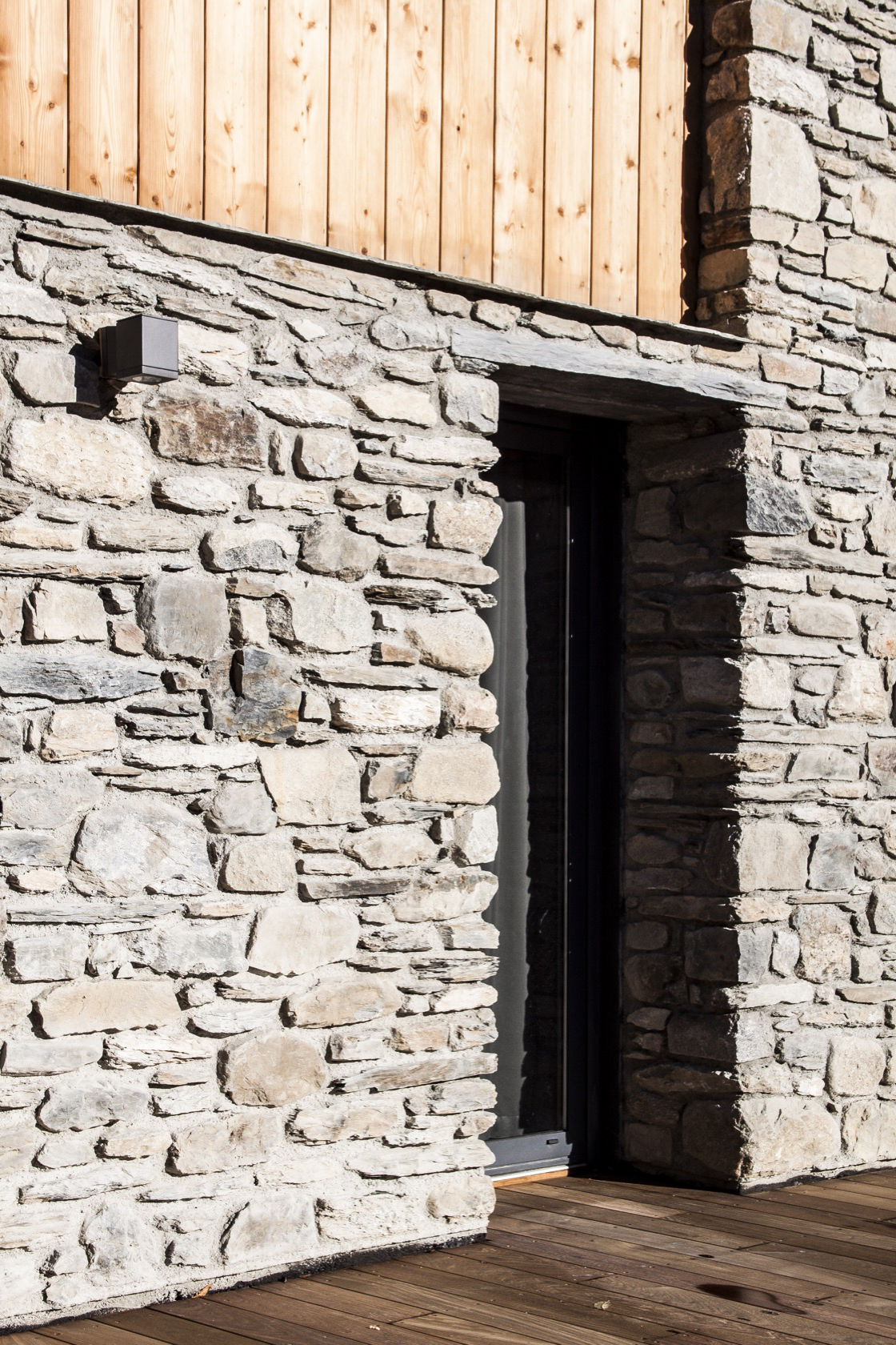 – Des socles massifs en pierre locale reprennent la thématique vernaculaire des murs de soutènements et permettent d’intimiser les terrasses, tout en définissant les espaces véhicules, piétons, publics et privés.
