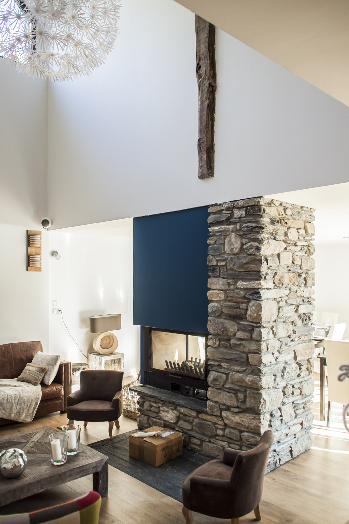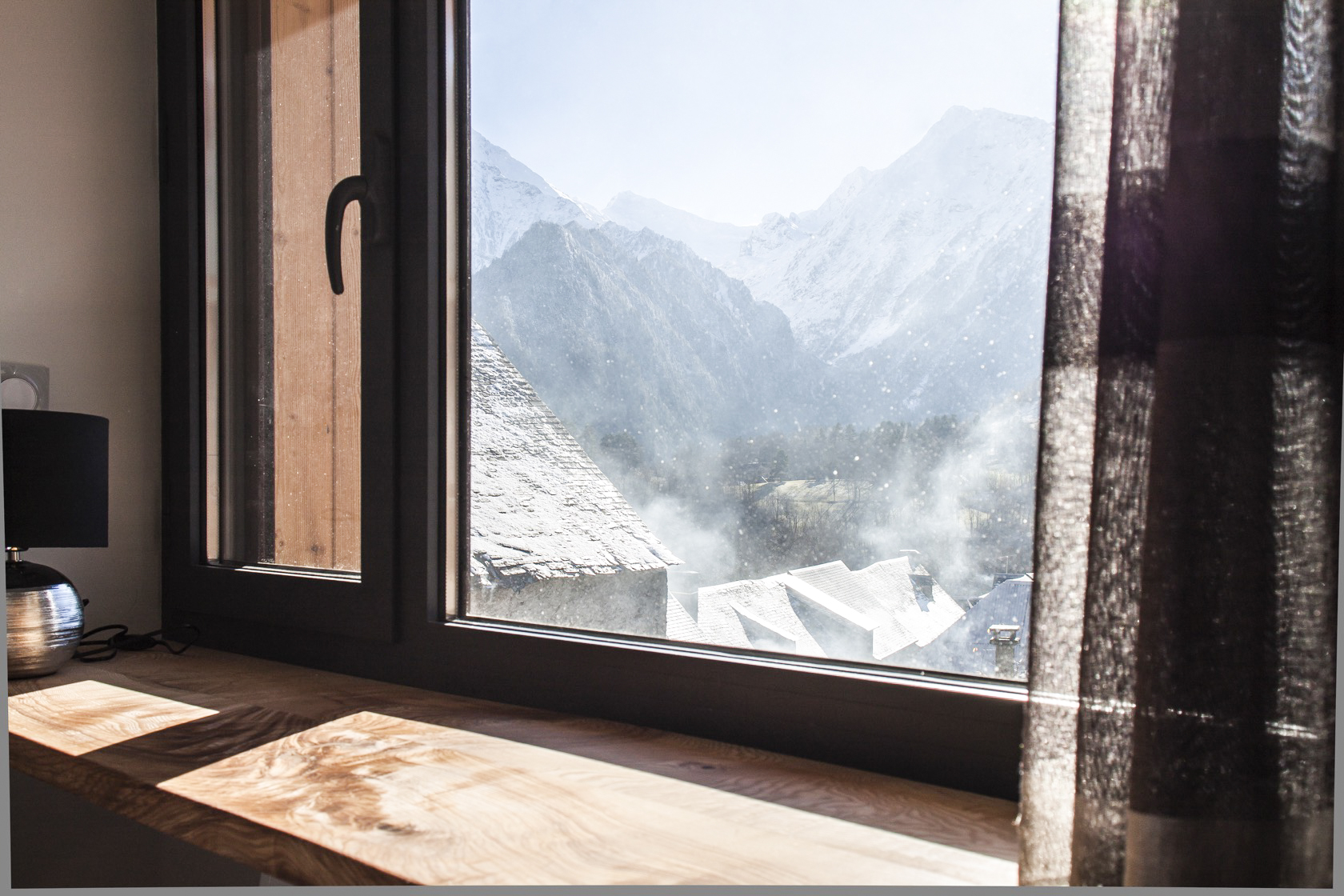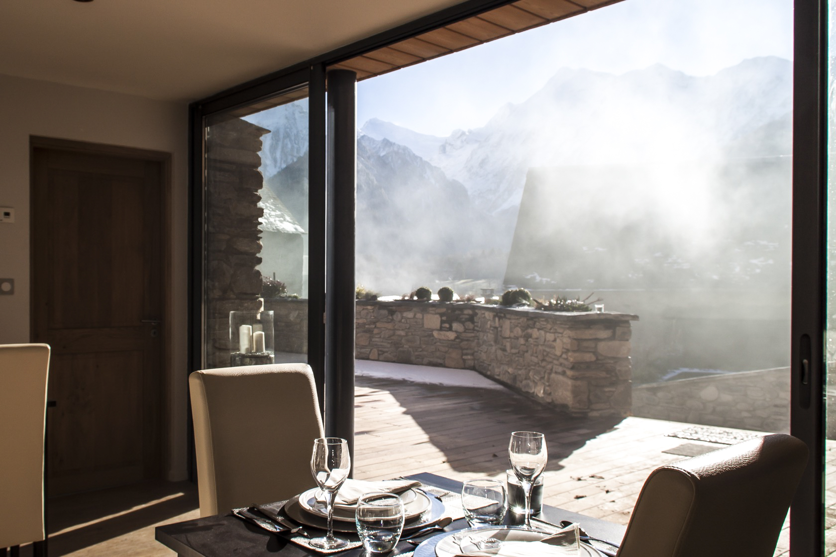 – Les volumes de l’habitation et celui des hôtes sont distingués par un creux vitré : le séjour/repas profite ainsi d’un grand cadrage sur les pics.