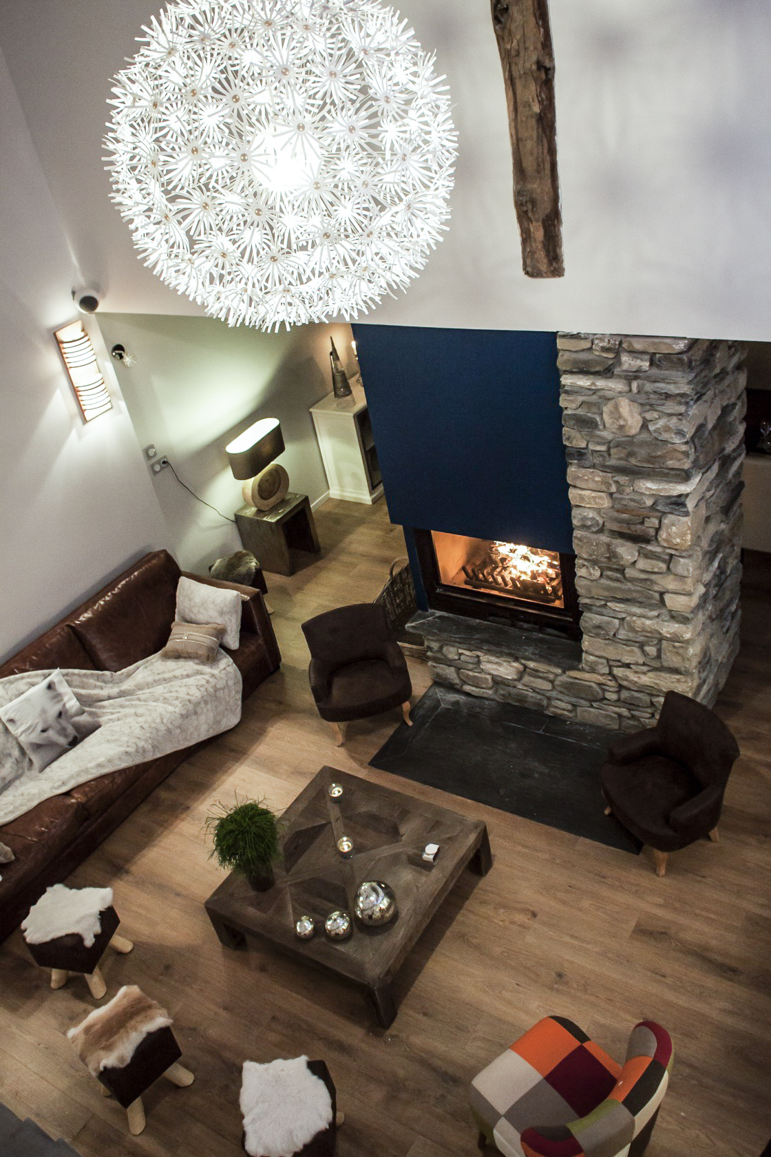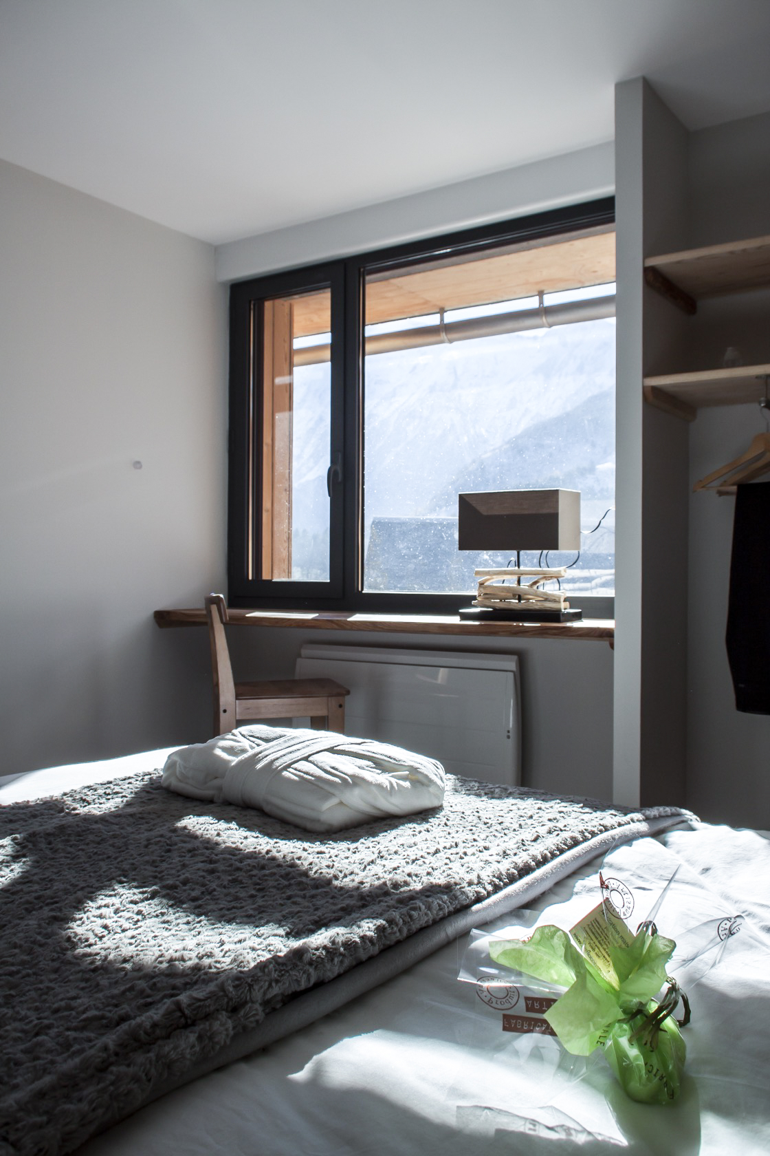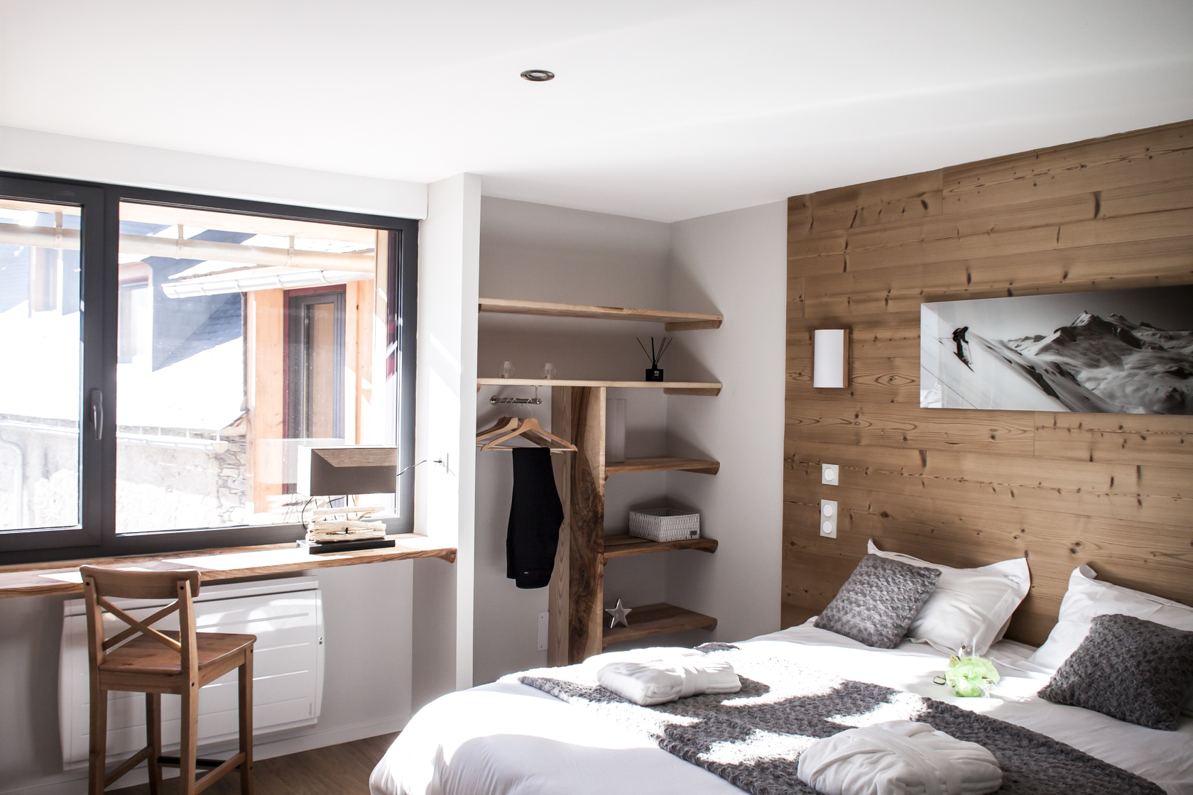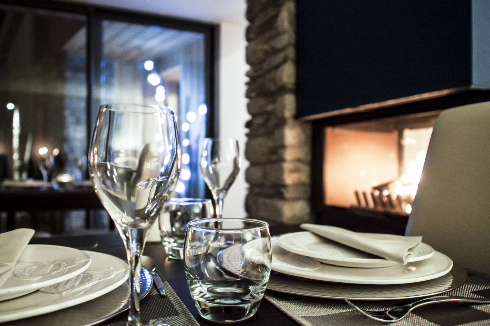 – Les volumes de l’habitation et celui des hôtes sont distingués par un creux vitré : le séjour/repas profite ainsi d’un grand cadrage sur les pics.