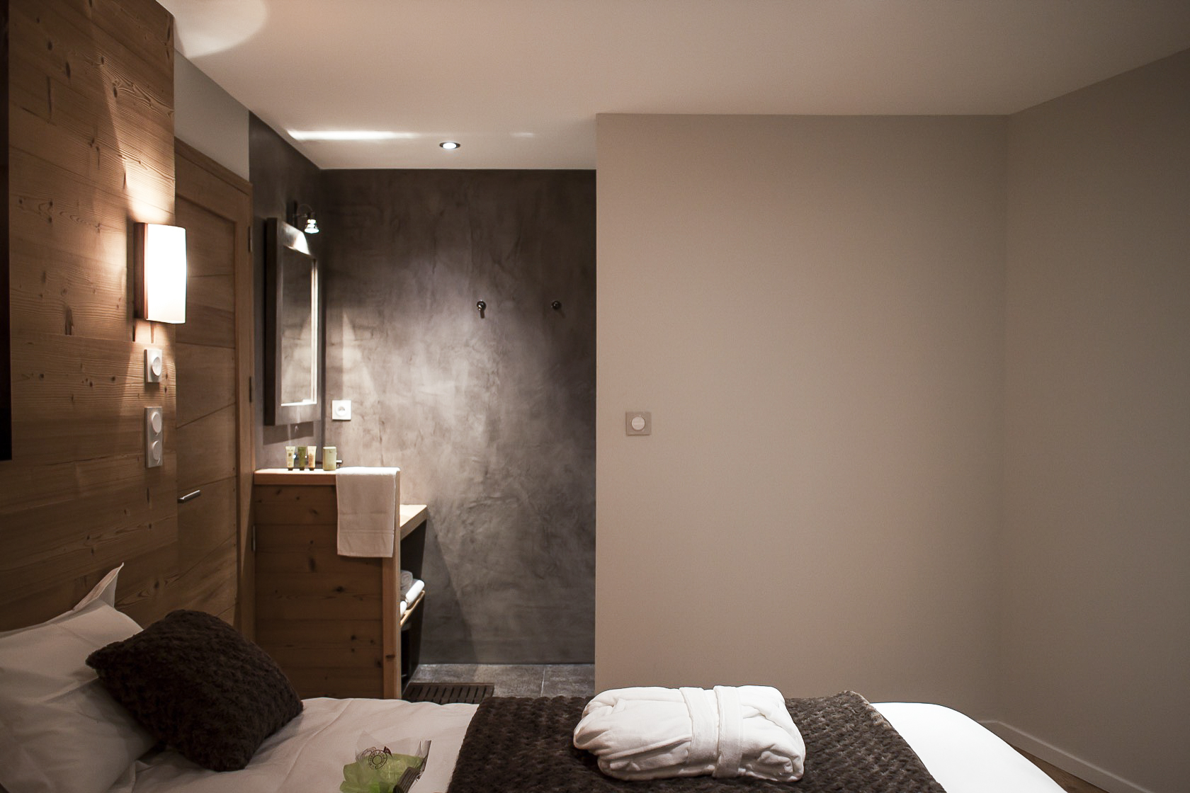 – L’étage, qui reçoit les chambres, est exprimé par un bardage en bois qui relie les deux ailes du bâtiment.
