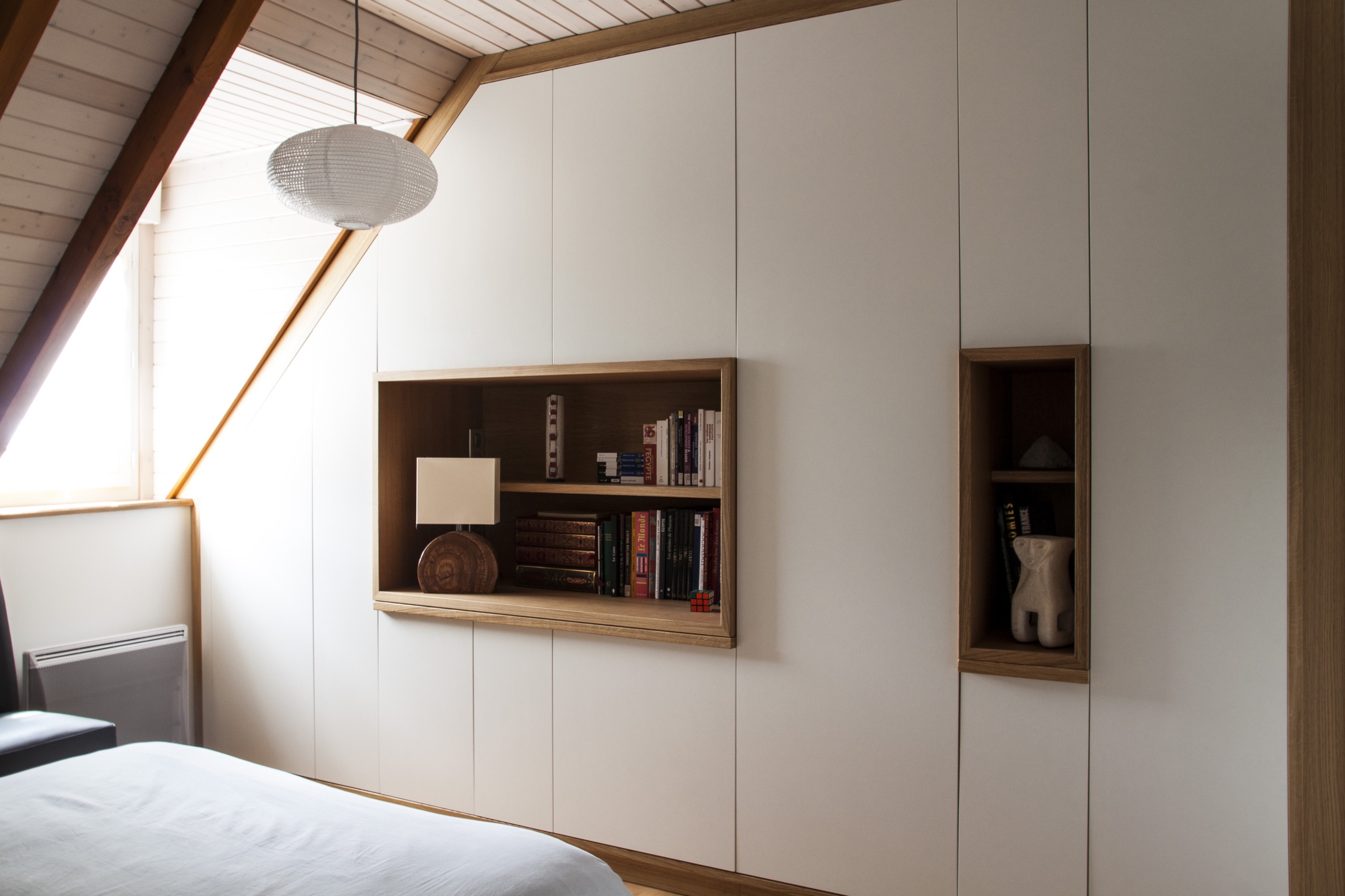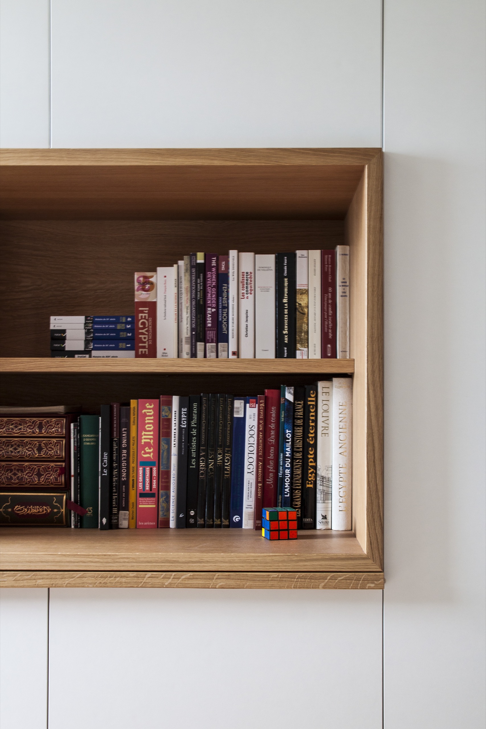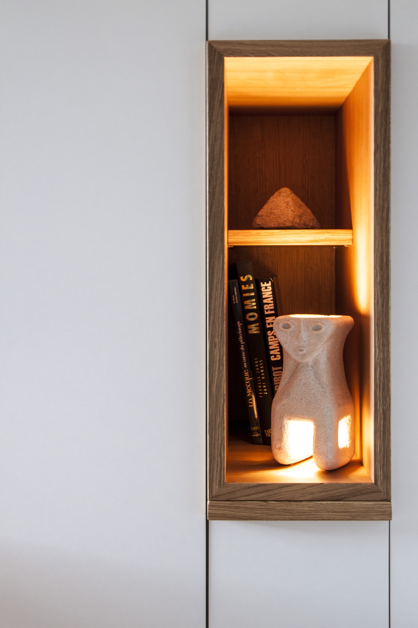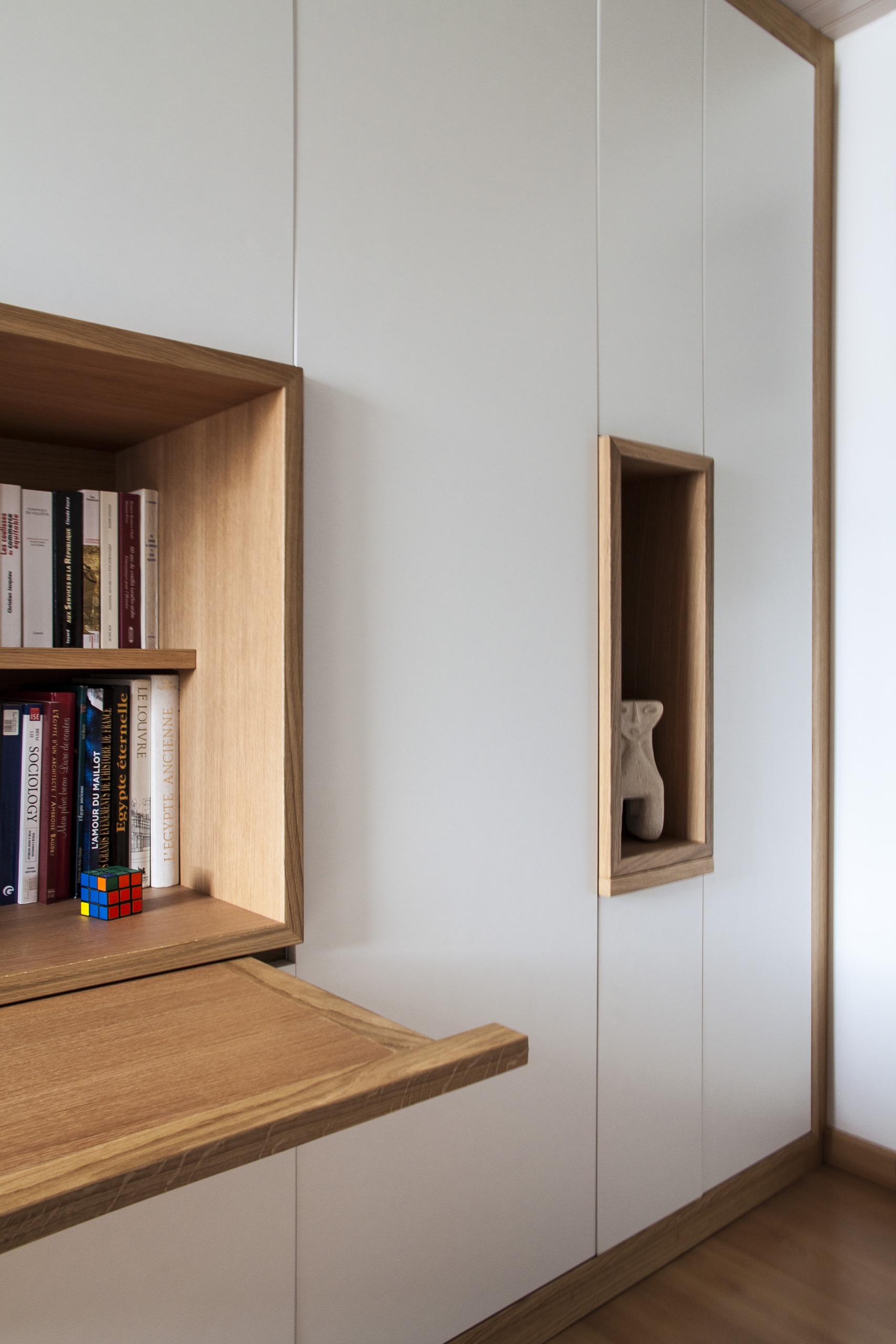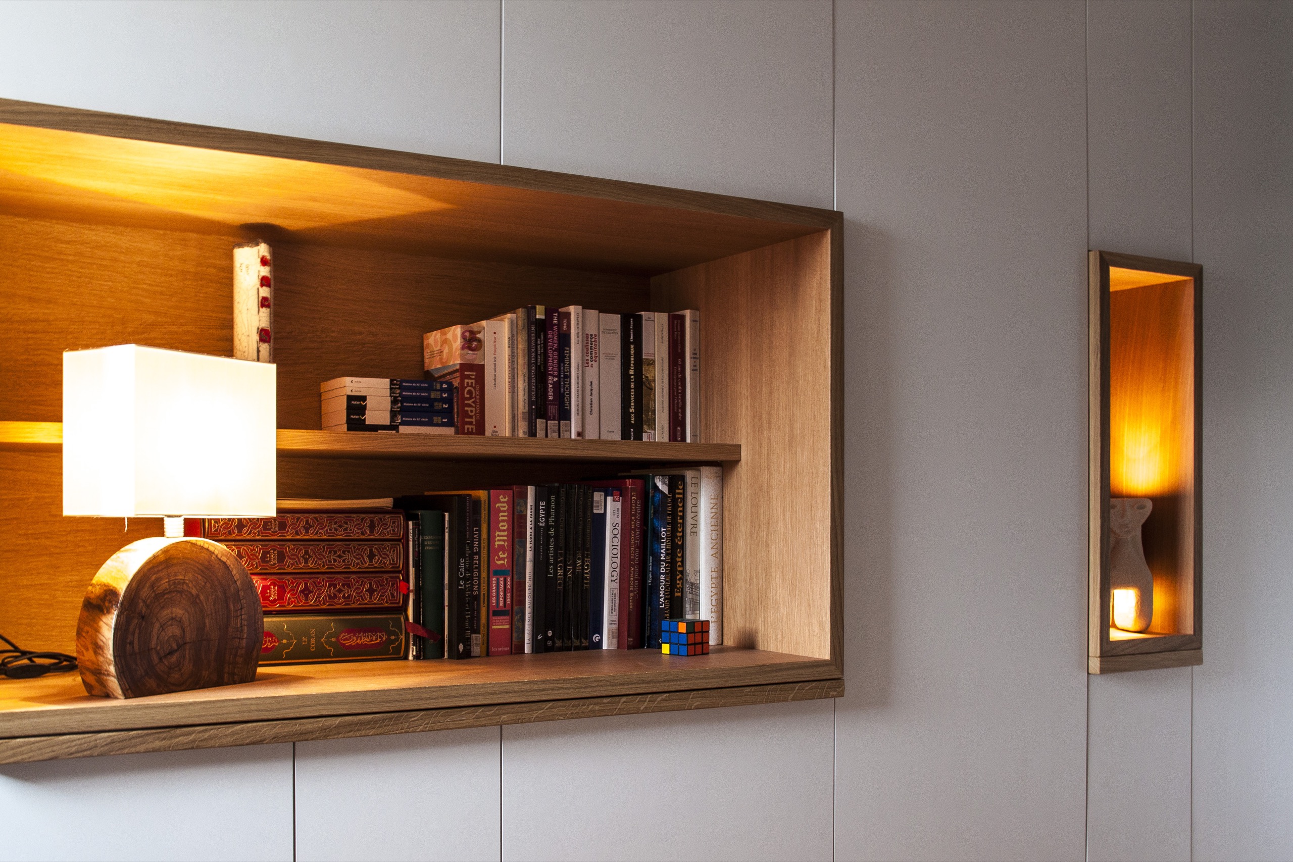 – des niches en chêne ont vocation de bibliothèques, d’étagères décoratives et de bureau amovible.